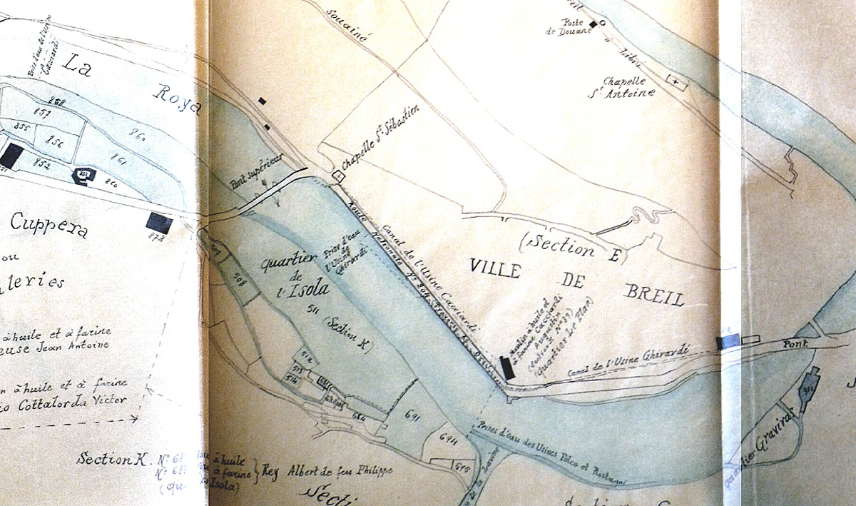 L’alimentation des moulins situés dans le village ou à proximité, se faisait à partir d’un captage au fil de la Roya ou de la Lavina. Les canaux d’environ un mètre de large furent d’abord à l’air libre, puis l’urbanisation progressant, ils furent peu à peu enterrés sous des voûtes maçonnées. Ils sont désormais à l’abandon et localement effondrés, mais certains tronçons de ces galeries sont encore accessibles (fermés au public).