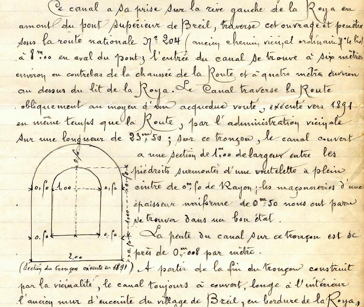 Le passant qui lève les yeux pour admirer les strates du Crétacé dans la falaise qui domine la porte de Gènes y découvre, à 20-30 m de haut, une ligne maçonnée accrochée dans la paroi rocheuse. Il s’agit d’un canal d’adduction d’eau vers les jardins des "Crotté". Cet ouvrage longe l’à-pic en conservant une pente d’écoulement régulière. Ce n’est pas le seul canal de la commune ayant un tronçon « périlleux » ou maçonné dans une paroi verticale, mais son exposition permet d’admirer l’audacieux ouvrage réalisé, en s’éloignant un peu de la porte de Gènes.